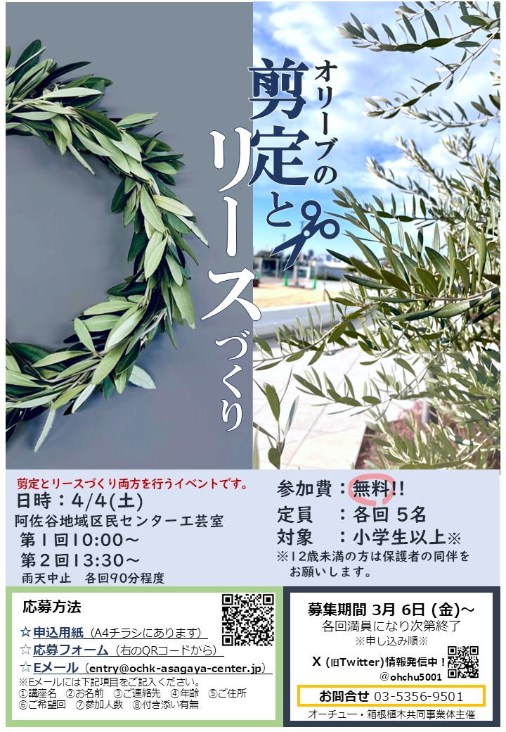 <詳細> 日時:2026年 4月 4日(土) 第1回 10:00~ 第2回 13:30~ ※各回90分程度(剪定45分+リースづくり45分) ※雨天中止