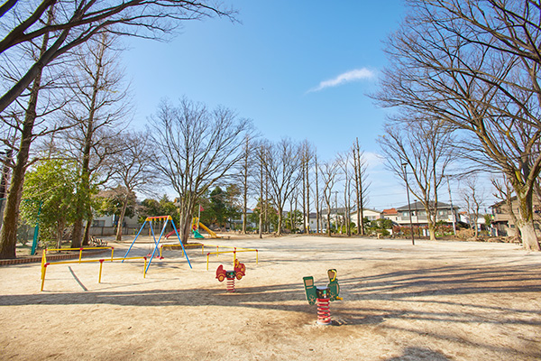 ・公園の中央に2つ並ぶ広場は、ひとつがゲートボールなどができる土の広場と、クローバーでおおわれた広場があります。白く光る土の地面と緑の草地が印象的で、いずれも明るく広々としています。土の広場のかたわらの、樹木に囲まれたしっとりした土の敷地には、丸太を組んでつくった大ぶりの木製遊具があり、子供達に親しまれています。