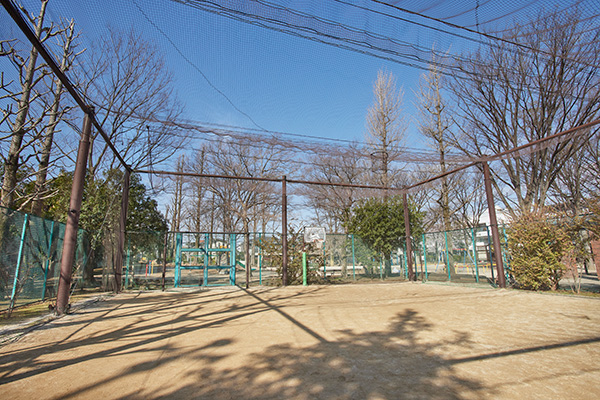 ・公園の一角には、梅里区民集会所が併設されています。赤レンガづくりのフジ棚をくぐって一番奥までいくと、そこには梅里区民集会所と一緒になった幼児向けの遊び場と砂場があります。その隣はネットフェンスで囲まれた球戯場です。